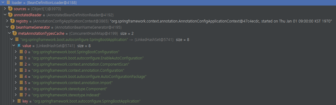 위 단계에서 지정된 BeanDefinitionLoader 는 Spring 구동을 위한 Annotation (or XML 등)의 Type 들을 Set 에 담고 있고 이를 통해 관련 Annotation 들을 Scan 하여 인스턴스(내부소스에서 BeanUtils.instantiateClass()를 사용한다.) 로 만든다. 이렇게 생성된 인스턴스정보들은 아래와 같다.