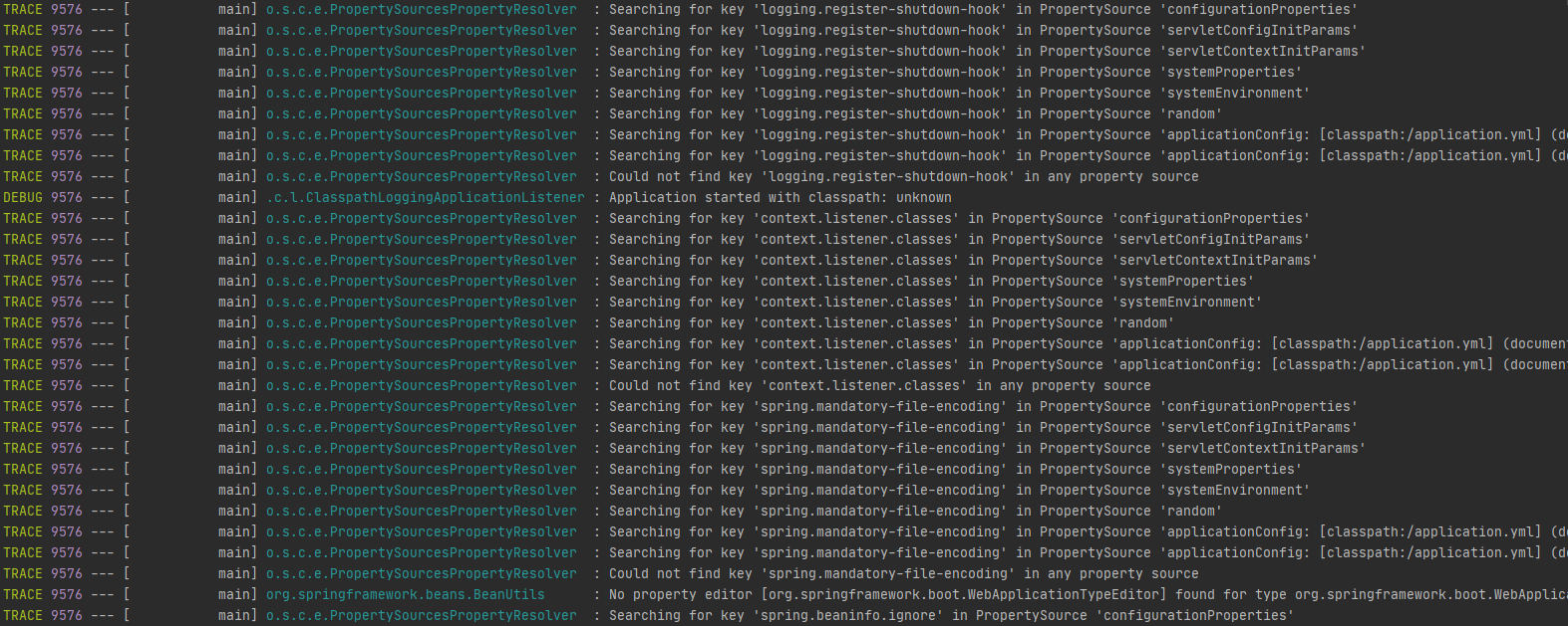 이처럼 log 를 잘 확인하면 SpringApplication 의 실행과정에 대한 상세정보를 확인할 수 있고 ConditionEvaluationReportLoggingListener 를 통해 실행과정에서의 정보(Positive matches, Negative matches, Exclusions, Unconditional classes) 를 report 받을 수 있다.