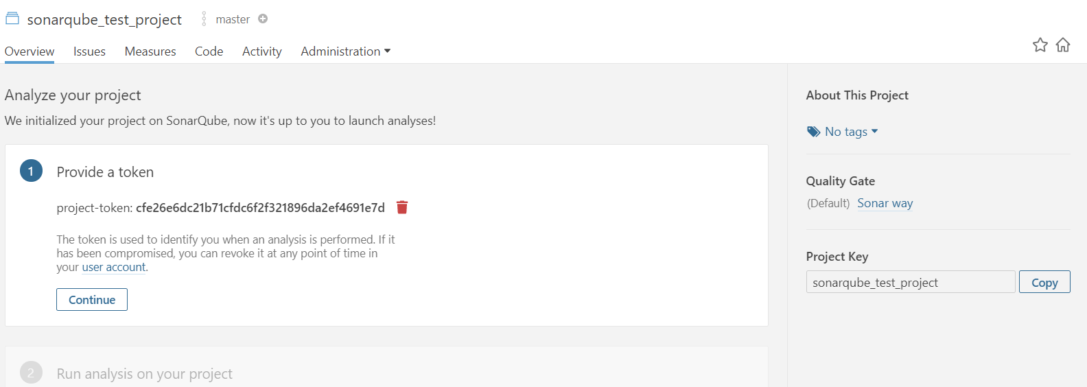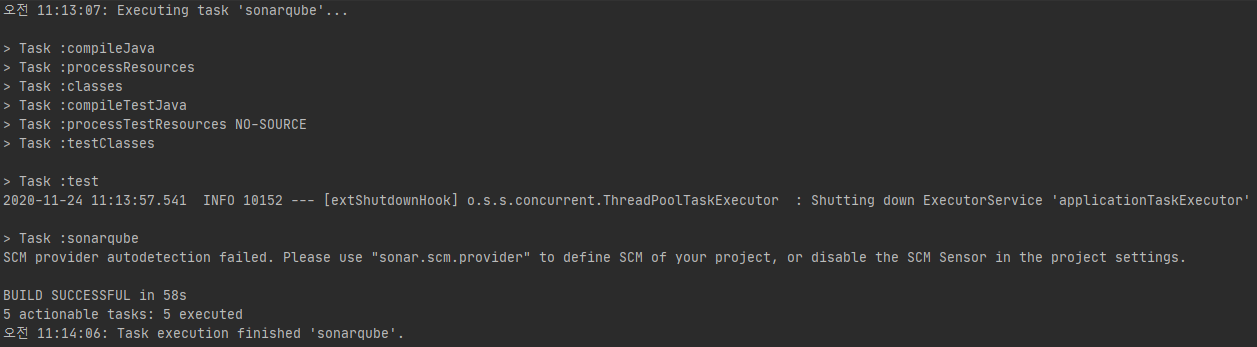 | ./gradlew sonarqube \ -Dsonar.projectKey=sonarqube_test_project \ -Dsonar.host.url=http://localhost:9000 \ -Dsonar.login=위에서 발급받은 token 값 입력 |