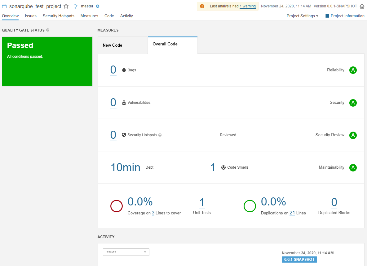 실제로 해당 프로젝트의 상세화면에서 New Code, Overall Code 를 확인할 수 있는데 이는 지속적인 품질관리를 위해 기존과 달리 새로 반영된 Code 에 대한 측정결과에 전체 코드에 대한 측정결과를 확인할 수 있게 해준다.