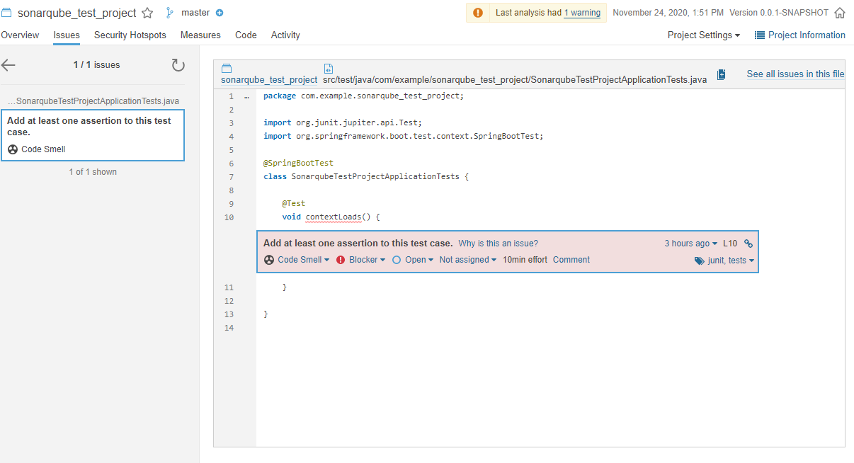위의 화면은 Issues 항목 중 하나이며 Code Smell 기준 Blocker 로 측정된 항목이다. 해당 화면에 표출된 분석 지표를 통해서 코드의 품질을 확보해야 하며 위의 예는 test case 에서의 assertion 이 없을 경우에 나타난다.