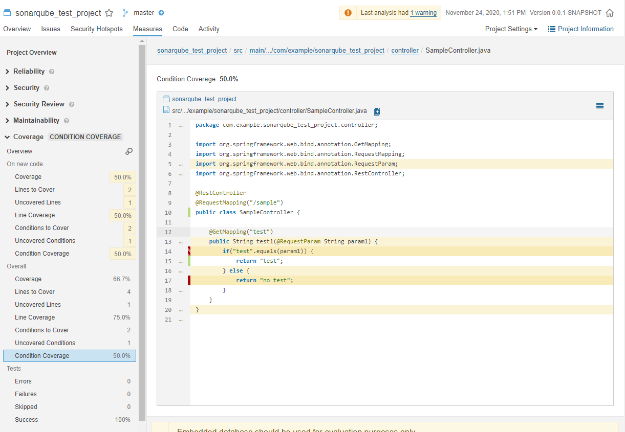 spring-boot 기준으로 간단한 컨트롤러를 작성한다. 아래의 코드 작성 후 sonarqube 를 수행하면 위에 설명한 각종 정보를 확인할 수 있는데 신뢰성이나 보안 역시 중요하지만 커버리지는 branch coverage 를 우선하여 품질을 검토한다.