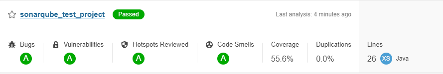 구성 후에 sonarqube task 를 실행하면 clean, jacocoTestReport 를 선 수행한 후 해당 결과로 생성된 jacoco.xml 파일이 sonarqube 에 반영되어 아래와 같은 결과를 확인할 수 있다.